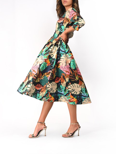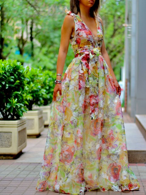Дълга рокля в пъстър десен от ефирна материя и V-образно деколте