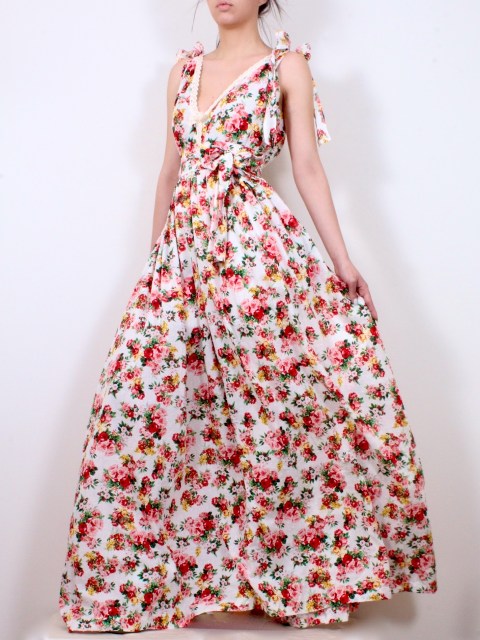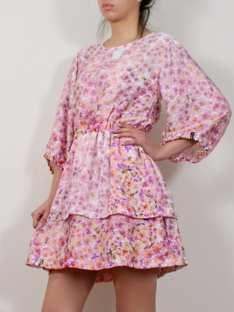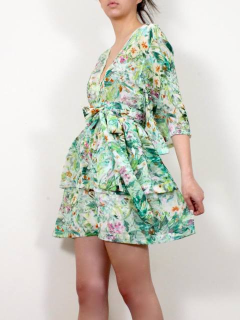 Къса шифонена рокля с волани в преливащ десен на малки цветя