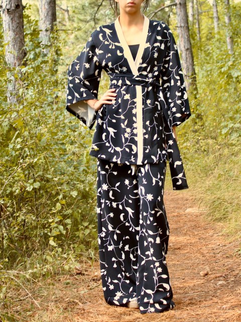 Сет от кимоно и панталон в десен на малки бежови цветя и черен фон