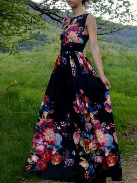 Промоция: Дълга рокля с изрязан гръб с връзки в десен на бели цветя и сив фон