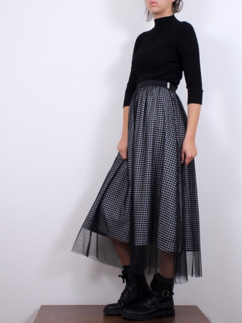 Двупластова миди пола в черно-бяло каре и ефирен тюл