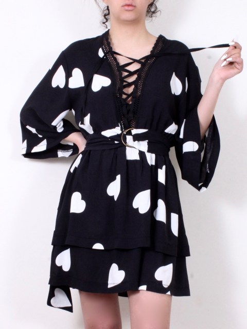 Къса рокля с волани в бохо стил и черно-бял принт на сърца