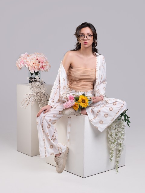 Къса асиметрична рокля с тънки дантелени презрамки от бяла рязана памучна дантела