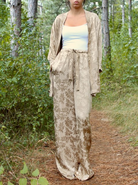 Сет от късо кимоно и широк панталон в пясъчно-златист десен
