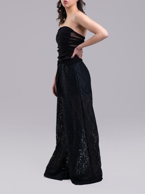 Дантелен широк панталон в черен цвят